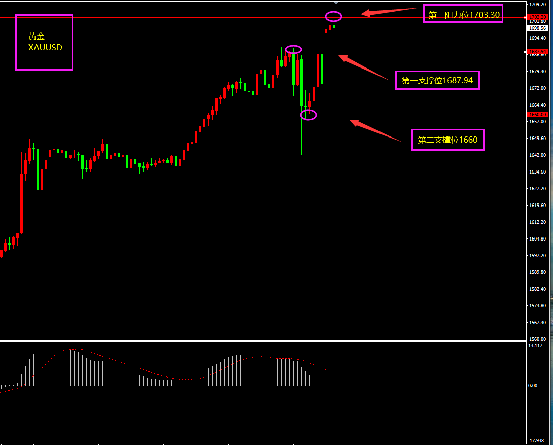 关注点:黄金上方阻力位1687是否突破?