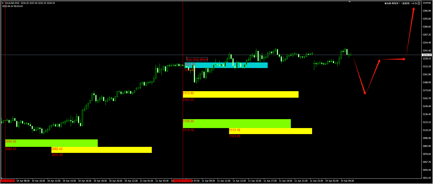 原油:由于特朗普暂缓全面对等关税90天,衰退担忧对于油价的压力大大减轻。我们上周五插件提醒的蓝色区域之后,回踩之后一波拉出200点的涨势。日内我们继续关注60.50附近的回踩确认信号。详细位置请咨询插件。