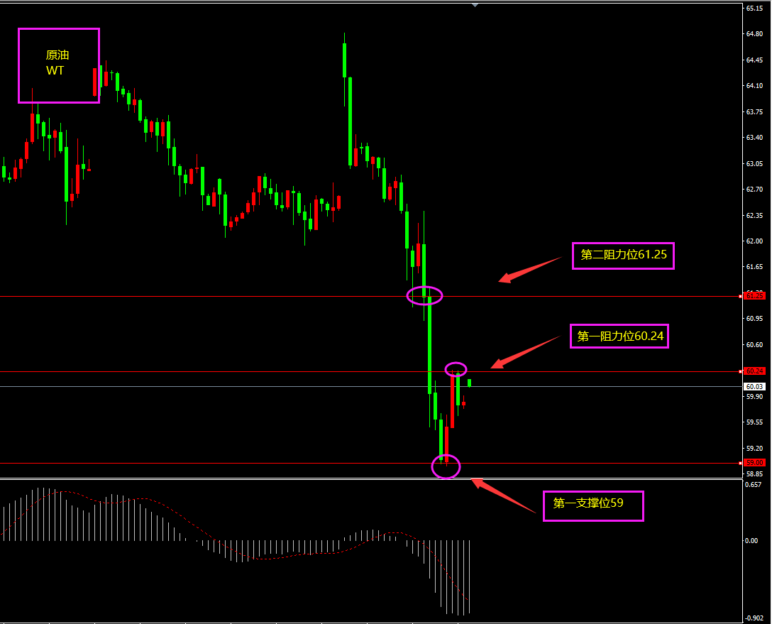 技术点评:天图原油收大阴线,避险潮退以及EIA库存增多促使油价暴跌逾500点,短期空头强势,近两日尽量不做逆势方向或者少做。日内更多以偏震荡为主。小时图原油价格期间暴涨暴跌,MACD转移至0轴之下,空头为主,底部目前出现连续大阳线,也接近59整数关口,底部多头小幅兴起,日内以看震荡为主?