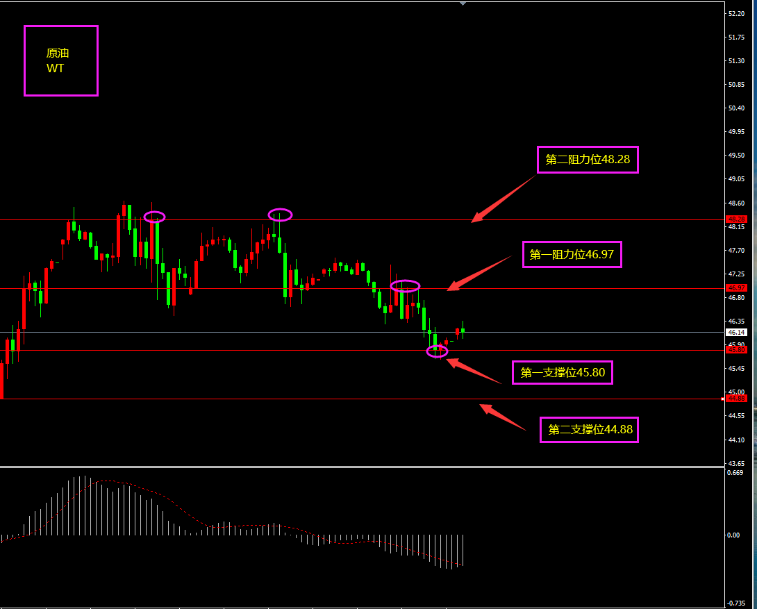 技术点评:天图原油收小阴线,近两日价格虽有下行,但目前底部未打破大阳线开盘价,“吞没形态”仍然有效,日内尽量保持以逢低看多为主。小时图原油期间有连续阴线回落,MACD转移0轴之下,空头小幅占优,市场焦点在日内OPEC减产会议,若俄罗斯减产,原油将迎来一波强烈反弹,日内尽量逢低看多为主。